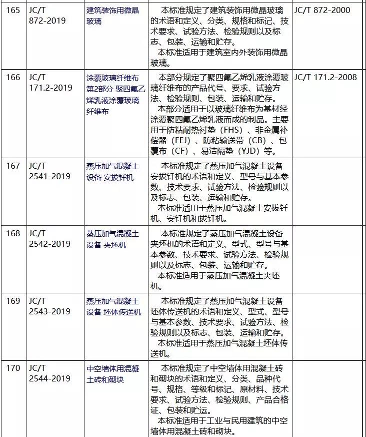 其中,涉及多項(xiàng)墻體材料產(chǎn)品、設(shè)備標(biāo)準(zhǔn),包括《蒸養(yǎng)泡沫混凝土制品用摻合料》(JC/T 2554-2019)、《蒸壓加氣廣西混凝土設(shè)備安拔釬機(jī)》(JC/T 2541-2019)、《蒸壓加氣混凝土設(shè)備 夾坯機(jī)》(JC/T 2542-2019)、《蒸壓加氣混凝土設(shè)備坯體傳送機(jī)》(JC/T 2543-2019)、《中空墻體用混凝土磚和砌塊》(JC/T 2544-2019)、《泡沫混凝土自保溫砌塊》(JC/T 2550-2019)、《絕熱材料中可溶出氯化物、氟化物、硅酸鹽和鈉離子的化學(xué)分析方法》(JC/T 618-2019)等。